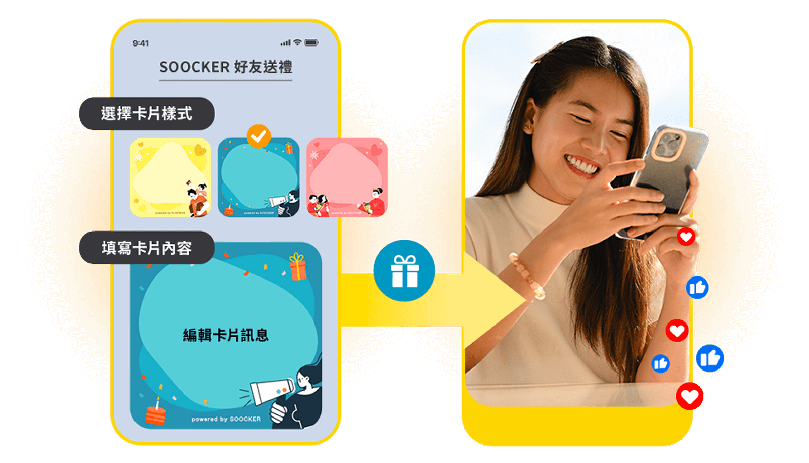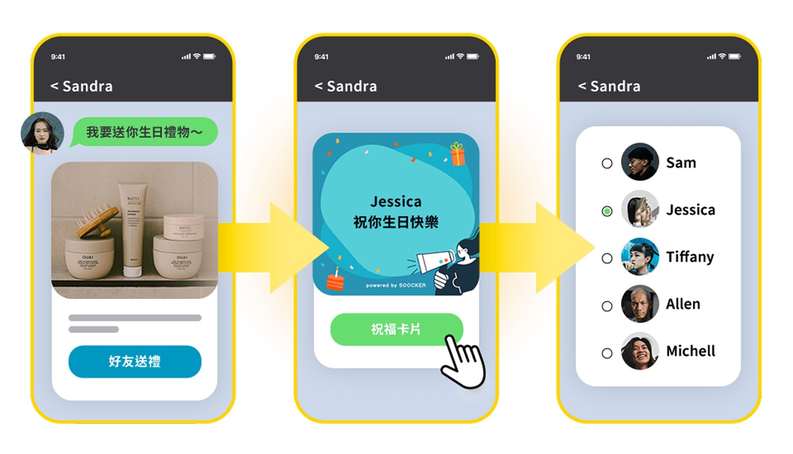 • 商品挑選、祝福卡片、好友選擇,一氣呵成