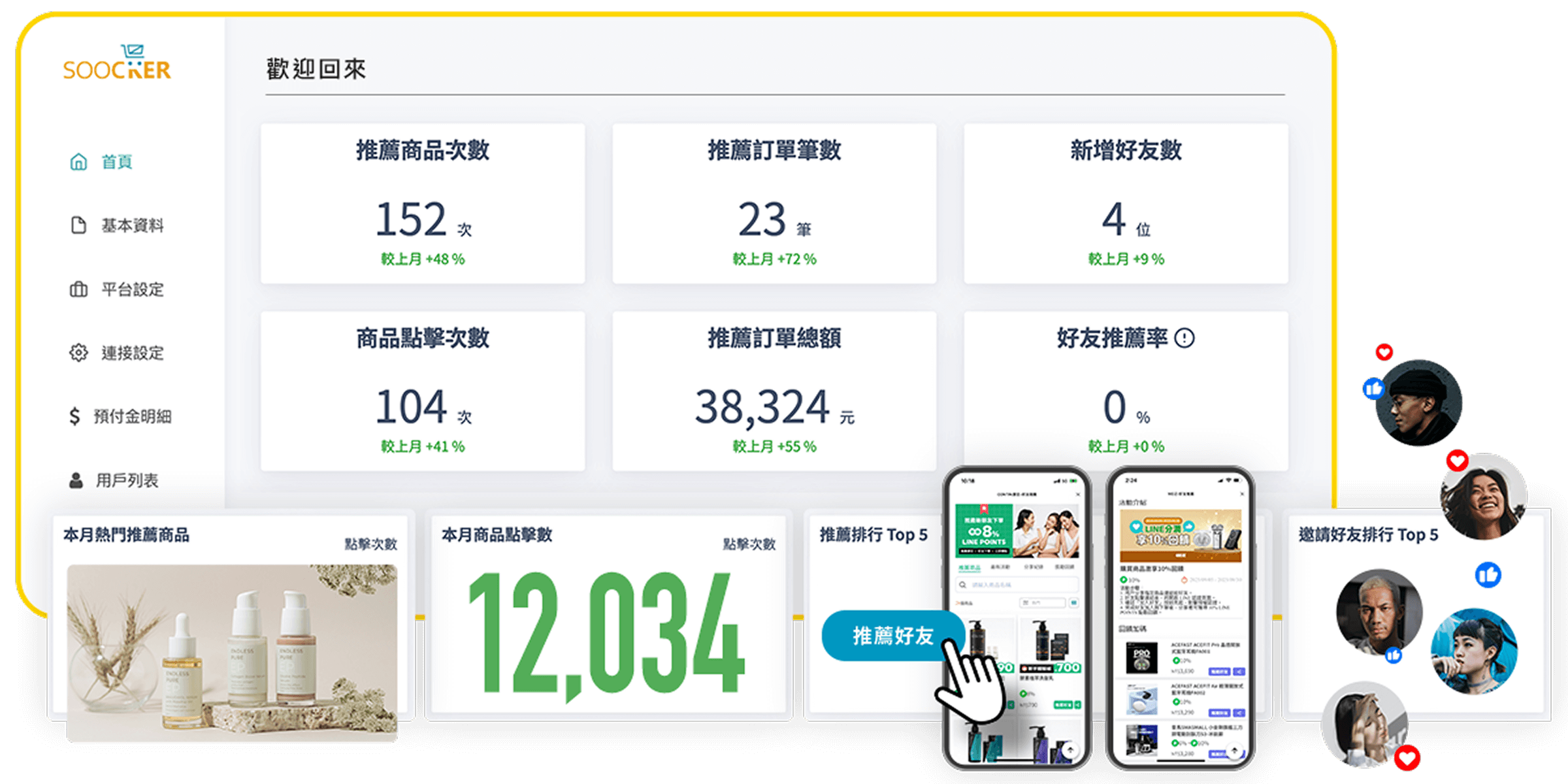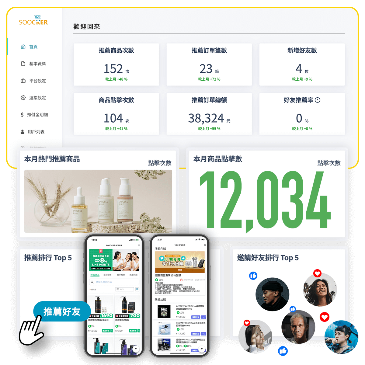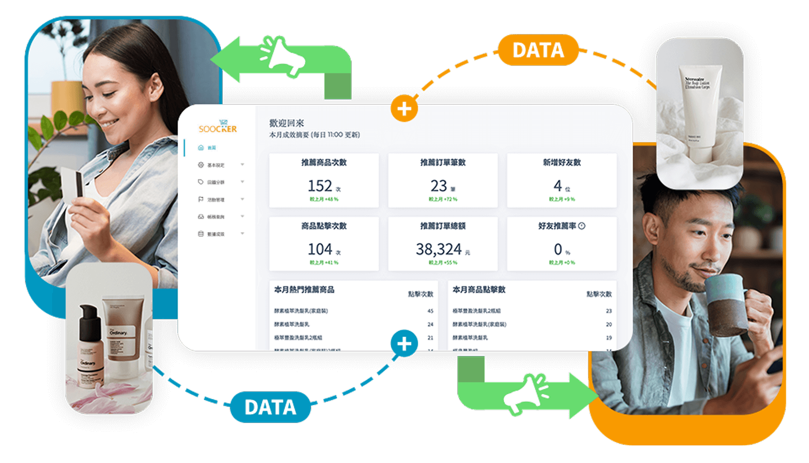 SOOCKER 好友推薦串接品牌的電商官網&LINE官方帳號,整合「消費者口碑」與「KOC導購」兩大行銷場景,協助品牌自動化經營私域流量。